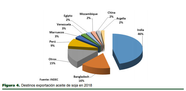 Argentina, volvió a posicionarse como el principal exportador de harina y pellets de soja, abarcando el 43% de este mercado global, con 24,2 millones de toneladas comercializadas. La principal causa de este posicionamiento, se encuentra en el incremento de la producción intensiva de carnes en el mundo, simétrico a los cambios en las pautas de consumo humano, y su efecto sobre la demanda de productos oleaginosos. Como se observa en la figura 3, son múltiples los destinos para la harina y el pellet de soja argentino. Se destaca Vietnam con 2,9 millones de toneladas, seguido de Indonesia con 2,4 Mt. El resto de los países mencionados participan con menos del 10% del total del volumen exportado. Argentina, tiene muy atomizada su demanda en este producto, lo que es favorable para hacer frente a cualquier variación estacional en la demanda internacional de este producto. En el año 2018, Argentina mantuvo el primer puesto en ventas al exterior de aceite de soja, con un volumen total exportado de 4,2 millones de toneladas. El valor de estas exportaciones, ascendió a 2.961 millones de dólares. Los despachos al exterior de aceite de soja, al igual que la harina, tuvo una caída interanual del 15% medidos en toneladas, y del 21% medidos en dólares. Al analizar la demanda del aceite de soja en la figura 4, se observa como principal destino de mercado a India, que adquirió el 46% de las ventas externas. Sobresale a su vez la participación de Bangladesh, Perú, Marruecos y Egipto y juntos demandan el 29% de las exportaciones. China que es el mayor consumidor de aceite de soja en el mundo, nucleó en 2015, el 10% de las exportaciones argentinas. A partir de 2016 dejó Figura 4. Destinos exportación aceite de soja en 2018 de importarlo como parte de su política de sustitución de exportaciones. Esta medida, que hizo aumentar la demanda China de poroto de soja, se sostuvo hasta agosto de 2018, cuando, a consecuencia de la disputa arancelaria con los Estados Unidos, el país asiático volvió a importar aceite de soja argentino. Durante el año 2018, también, se registraron exportaciones de biodiesel por 1.350 millones de litros (971 millones de dólares), lo que implica una caída del 28% en relación a lo exportado en los años 2016 y 2017. Uno de los factores que influyó en esta merma fue el cierre del mercado estadounidense (barrera arancelaria), país que hasta el año 2017 había sido el principal importador de biodiesel argentino. El otro factor, fue la determinación del gobierno argentino de aumentar las retenciones para el biodiesel del 8 al 13,04%. El principal destino de estas exportaciones fue la Unión Europea, gracias a la reapertura de este importante mercado a fines de 2017. Las menores exportaciones registradas se vieron parcialmente amortiguadas por un aumento del consumo interno de biodiesel que fue el mayor registrado históricamente en nuestro país. El mismo ascendió a un 10,8% con respecto al año pasado, ubicándose en 1.480 millones de litros. Esto permitió que la tasa de corte de gasoil con biodiesel alcanzara un 10,3%, superando por primera vez la tasa obligatoria de corte del 10% que se había establecido en el año 2014. Finalmente, es importante destacar que las exportaciones vinculadas a la cadena de soja en su conjunto representan un valor económico del 24,4% del total de exportaciones del año 2018 y constituyen el principal rubro de ingreso de dólares a la economía nacional. Sumaron 15.050 millones de dólares, de los cuales el 61,1% correspondió a harinas y pellets de soja, 19,7%, a aceite de soja, 9,7% a porotos de soja, 6,5% a biodiesel y 3,1%, a otras exportaciones (glicerol, lecitina y residuos).