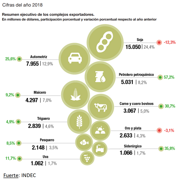 Según un informe del INDEC, en el 2018 los principales complejos exportadores fueron: primero el Complejo Soja (que contiene a la soja –porotos, aceites, pellets y harinas), el cual fue el de mayor relevancia. En segundo lugar le sigue el complejo automotriz, tercero el petrolero-petroquímico, cuarto el maicero –granos y harinas–, quinto el complejo de origen bovino (comprende carne, lácteos y cuero) y sexto el triguero (granos, harinas y pellets– los más destacados).
