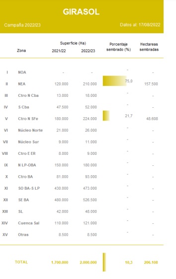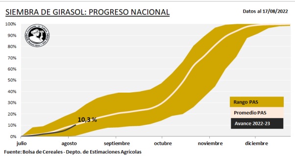 Por su parte, en el Centro-Norte de Santa Fe, luego de las lluvias de la semana anterior, el progreso de siembra en la última semana fue de 13,7 p.p., alcanzando a incorporar el 21,5 % del área proyectada. En esta región, la emergencia se encuentra demorada por las bajas temperaturas. En el resto del área agrícola, la intención de mantener o incluso incrementar el área se sostiene a pesar de la limitante de agua y semillas. Mientras que en los núcleos girasoleros del sur del área agrícola las recientes lluvias han mejorado el escenario, en zonas marginales afirman que, de recibir lluvias en las próximas semanas, llevarán adelante la siembra con los materiales disponibles