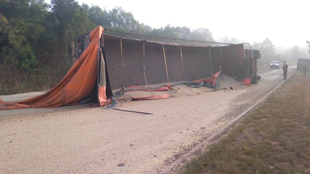 Este lunes por la mañana volcó un camión cargado de soja en la Ruta Provincial Costera N°2, altura Paraje Aguas Blancas Colonia Aurora, provincia de Misiones. El conductor fue trasladado de urgencia al hospital local.