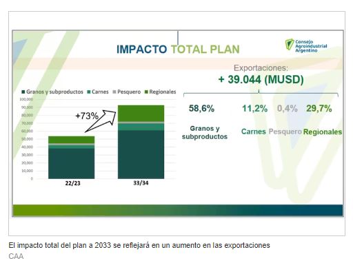 El impacto de estas políticas, aseguraron, hará que el ingreso de divisas, para 2033 aumente en US$39.044 M; 73% más respecto de los números actuales. De este monto, los granos y subproductos aportarán US$22.897 M.