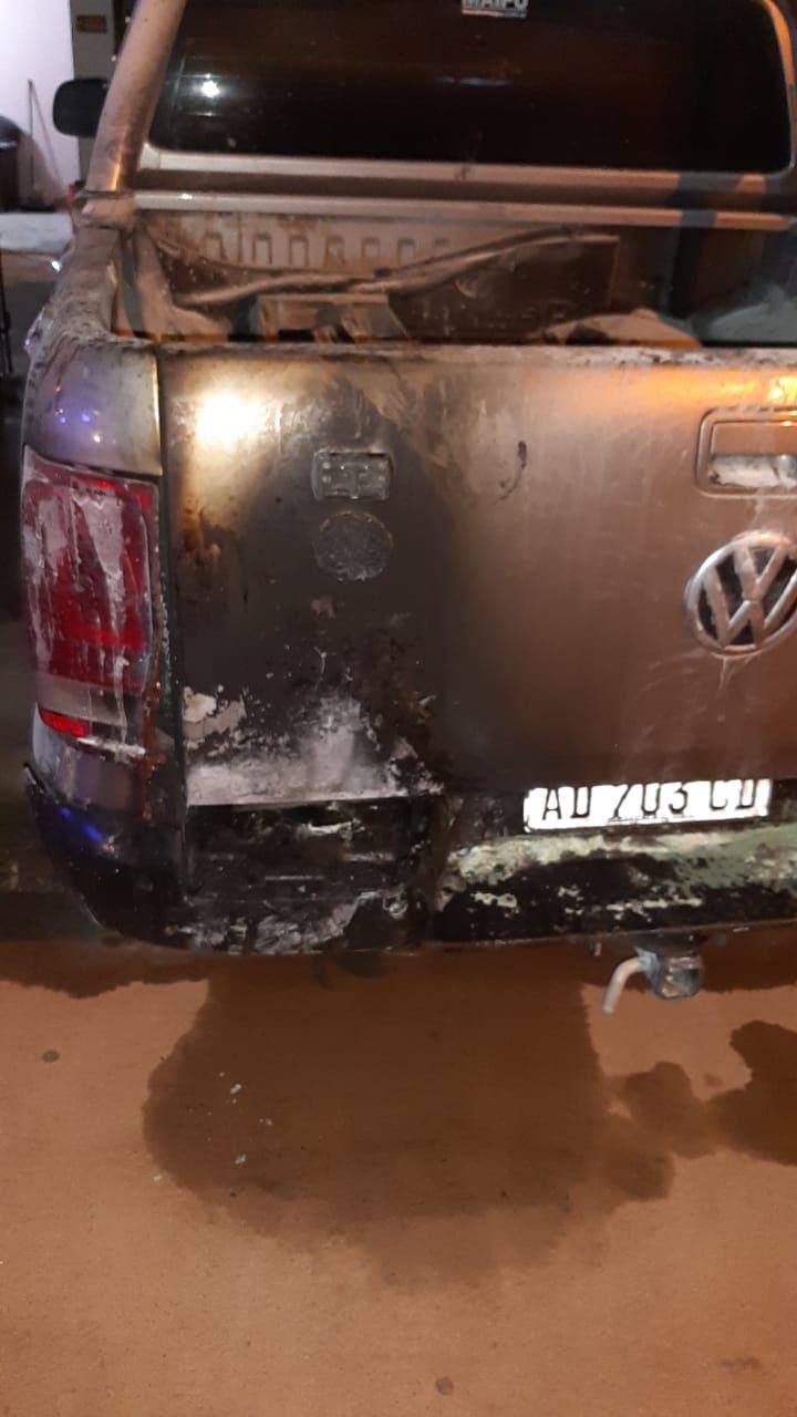 La camioneta atacada por bombas molotov, según la denuncia del productor