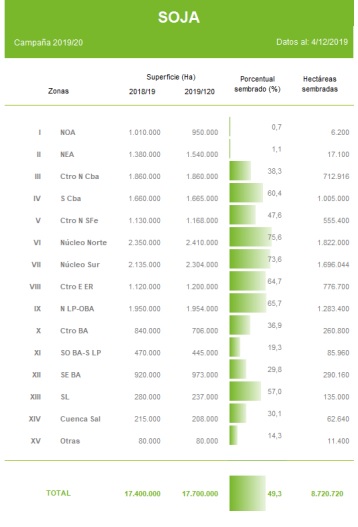 Con un avance intersemanal de 10,3 puntos porcentuales, se cubrió el 49,3% del área proyectada en 17,7 MHa. La soja de segunda acumula un avance de 4,8 punto a lo largo de la última semana.
