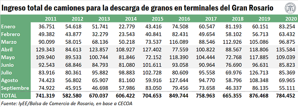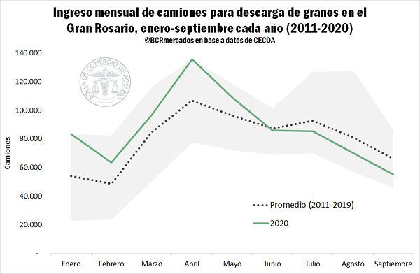 En el análisis mensual, enero y febrero abrieron el año con ingresos de camiones mayores a 2019, pero en marzo los ingresos se resintieron un 8% debido principalmente a las dificultades que hubo para el tráfico de bienes por las rutas del país apenas comenzaron a diseminarse las infecciones por COVID-19. Muchas comunas cerraron el tráfico por temor a los contagios y, sin protocolos definidos, reinaba la incertidumbre. Aun así, en el primer trimestre de 2020 el ingreso de camiones a puertos/plantas se ubicó un 10% por encima de igual período en 2019 como así también del promedio de los últimos 5 años.