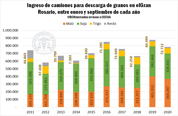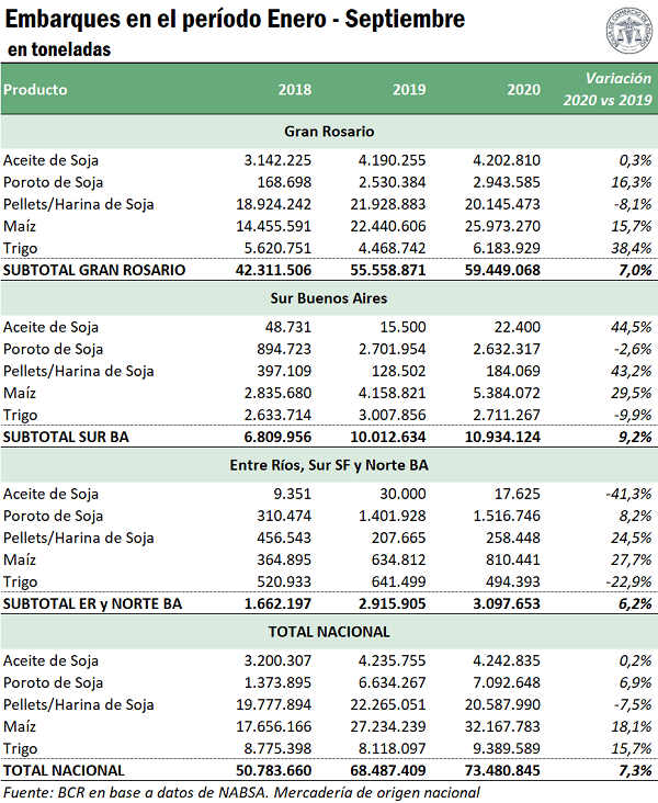 Los totales negociados en lo que va del año con entrega en el polo industrial exportador del Gran Rosario siguieron las mismas tendencias de los totales generales. En los primeros 9 meses de 2020, el Gran Rosario concentró el 51% de los negocios granarios concertados en Argentina (vs. 54% en 2019 y 52% en 2018).
