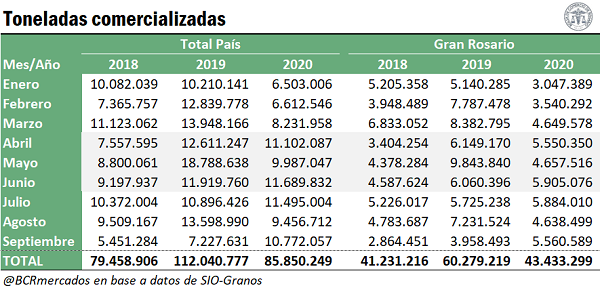 Finalmente, los registros del tercer trimestre de 2020 totalizan 31,7 Mt, en línea con la actividad comercial de julio, agosto y septiembre del año pasado, y un 25% por encima del volumen negociado en igual período de 2018.
