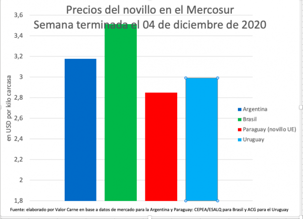 Argentina: el novillo pesado apto para Europa alcanzó los USD3,18, con una suba de 28 centavos (casi 10%) . La fuerte competencia desatada entre los industriales elevó las ofertas en más de $22 en promedio. No hay registros de semejante incremento en una semana en los últimos años y los que se acercan, sucedieron contemporáneamente con una devaluación importante, lo que no es el caso actual. Desde principios de 2018 que no se veía una cotización por encima de los USD3. Superó al valor vigente en Uruguay, lo que no se registraba desde aquella misma época y sólo Brasil reviste un precio mayor en la región.