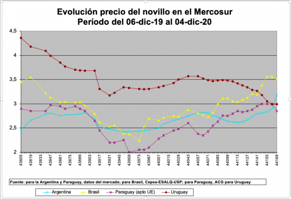 Paraguay: otra plaza de fuerte cambio, pero hacia abajo. Los USD2,85 por el novillo terminado apto para la UE, representan un retroceso semanal de 15 centavos (5%). Con un aumento sensible de la oferta en anticipación al cierre del año, la industria ofreció valores menores en consonancia con el pobre clima de negocios que existe en los mercados externos. Hay que resaltar que, por la situación del mercado europeo la hacienda apta para ese mercado no es buscada y casi no se hacen operaciones. Para mantener la consistencia, como siempre indicamos el precio de ésta, tomamos los 2,85, que resultan algo más nominal que otra cosa. La hacienda general se paga 2,80.