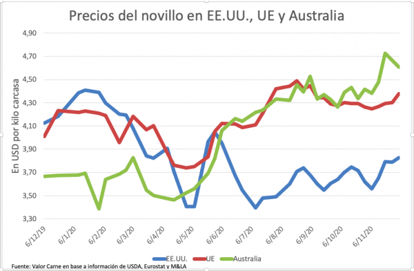 En los últimos dos meses la Argentina viene mostrando alzas incesantes en el precio del novillo, que se agudizaron en esta semana. Desde los USD2,61 de principios de octubre a hoy, el novillo pesado acumuló una valorización de 22% en dólares, a pesar de la mala situación que presenta el mercado europeo, principal demandante de sus cortes más valiosos.