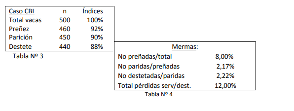 - Merma SERVICIO-PREÑEZ (No Preñadas) En esta etapa son tenidas en cuenta las pérdidas de terneros por vacas no preñadas al finalizar el servicio. Las vacas se hallan con su reciente cría al pie en plena lactancia, y se han incorporado los toros al rodeo, las vacas inician su contacto con los toros. El rodeo está en pleno período de servicio. Previo al servicio los toros deben ser revisados para descartar los casos con posibles lesiones del aparato locomotor (pezuñas, aplomos, golpes, etc.) y ojos; órganos reproductivos con anatomía normal y funcional (testículos, pene, prepucio, vesículas seminales), además de “raspajes prepuciales” o diagnóstico de enfermedades venéreas (Campylobacteriosis y Trichomoniasis), sangrados para diagnóstico de Brucelosis, y la intradermoreacción para Tuberculosis. También las vacas son sangradas para Brucelosis y se les realiza diagnóstico de Tuberculosis. Previamente son recomendables las pruebas de Capacidad de Servicio a los toros, para ver cuál es la cantidad de toros necesarios a utilizar de acuerdo a su potencial, y no usar más de lo necesario para evitar peleas o competencia entre ellos, lo que puede ocasionarles lesiones de diferente gravedad. En caso de no hacer esta prueba, es de mucha utilidad realizar la prueba de Aptitud Reproductiva o de monta, o sea ver la posibilidad que tiene cada toro de realizar sin problemas un salto completo, observando y rechazando así toros con lesiones de pene (fimosis, parafimosis, pene en espiral) o dolores articulares en miembros posteriores que dificulten un salto normal y su caminar. Durante esta etapa se han observado casos de toros con fimosis, que no solo no podían realizar el servicio, sino que al tener mucha líbido y muy elevado peso corporal, provocaban serias lesiones en las vacas “alzadas”, llegando a inutilizar y hasta descaderar vacas por sucesivos y reiterados saltos que no se llegaban a concretar.