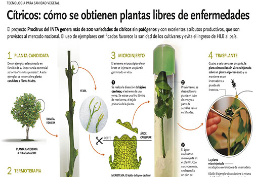 El proyecto Procitrus del INTA genera más de 200 variedades de cítricos sin patógenos y con excelentes atributos productivos, que son provistos al mercado nacional. El uso de ejemplares certificados favorece la sanidad y evita el ingreso de HLB al país.