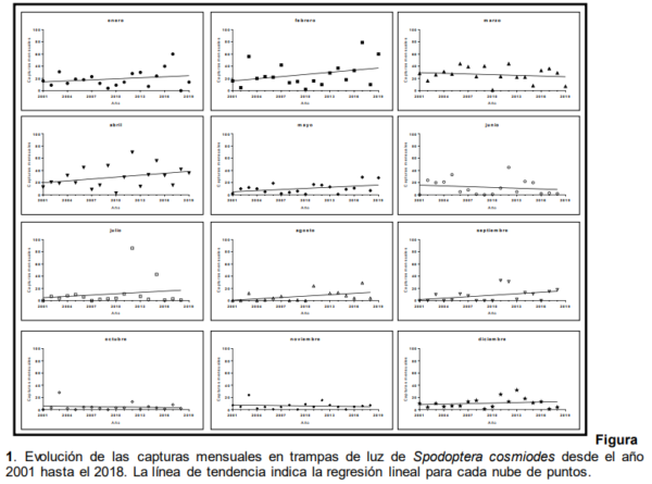 Monitoreo en trampas de luz e identificación de especies de Spodopteras presentes: Dentro del complejo de especies de Spodoptera que afectan al cultivo de soja intacta en el sudoeste del Chaco se destacan S. cosmiodes y S. eridania. Los análisis de las capturas de individuos adultos de S. cosmiodes en trampas de luz desde el año 2001 hasta el año 2018 muestran una tendencia de incremento en las capturas en los meses de enero, febrero, abril mayo, julio, agosto y septiembre mientras que no se observan variaciones en los meses de marzo, junio, octubre, noviembre y diciembre (Figura 1). El análisis de las capturas también nos ha permitido determinar la presencia, en las últimas tres campañas, de S. eridania, especie observada por primera vez en las trampas de luz en el año 2016 (datos no mostrados), siendo frecuente su aparición a partir del mes de abril salvo esta última campaña 2018/19 que fue registrada ya en el mes de febrero.