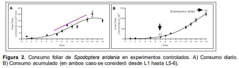 Consumo foliar: El consumo diario de S. eridania se fue incrementando conforme las larvas pasaban por los diferentes estadios. En la primera semana, cuando la mayoría de las orugas se encontraban en estadio L3, el consumo diario no llego a 5 cm2 de hoja, luego a partir del día 8 (estadio larval L 4) el consumo por día fue superior a 5 cm2 e fue incrementándose hasta llegar a 20 cm2 de hoja consumida por día en L5-6 (Figura 2 A). El consumo acumulado, desde larvas neonatas hasta L3, fue de 9,2 cn2 de hoja mientras que desde larva neonata hasta L5-6 el consumo fue en promedio de 121 cm2 de hoja la que representa que desde L4 a L6 últimos estadios larvales consume el 92 % del total (Figura 2 B).