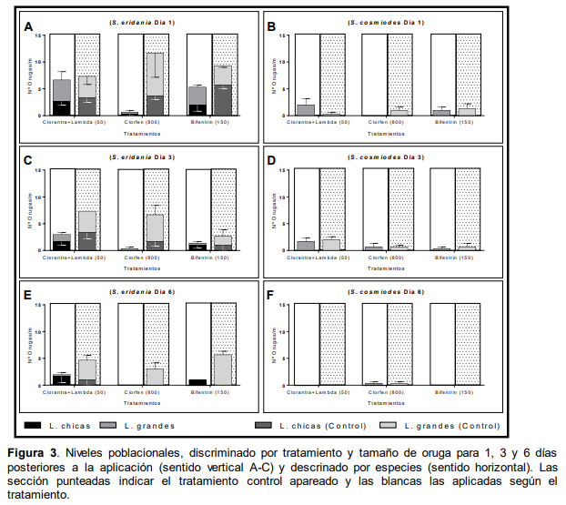 Control químico: En el ensayo de control, las especies presentes fueron S. eridania en mayor proporción con larvas chicas y grandes y S. cosmiodes en menor proporción y con larvas de tamaño grande. A las 24 horas de la aplicación el tratamiento con Clorfenapir en dosis de 800 ml/ha mostro ser efectivo para el control de larvas chicas y grandes de ambas especies (Figura 3 A-B). A partir de los tres días de realizada la aplicación se observa que los tres productos evaluados (Clorfenapir, Clorantraniliprole + Lambdacialotrina y Bifentrin) mostraron ser eficientes principalmente en el control de larvas chicas en este caso de S. eridania, mientras que ninguno de los productos pudo controlar las larvas grandes de S. cosmiodes (Figura 3 C-D). Sin embargo a los seis días de la aplicación, los tres tratamientos ensayados mostraron ser eficientes en el control de S. eridania ya que redujeron significativamente el número de orugas grandes en comparación a su control apareado (Figura 3 EF).