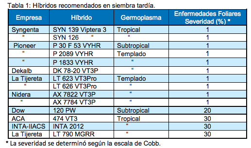 Es importante tener presente que, entre los cultivares recomendados, algunos híbridos como LT 790 MGRR, INTA 2012, ACA 474 VT3 y 120 PW fueron afectados por enfermedades foliares, por lo que en caso de implantar estos cultivares se debería prever que de ocurrir condiciones predisponentes antes de floración se recomienda efectuar pulverizaciones preventivas con fungicidas.