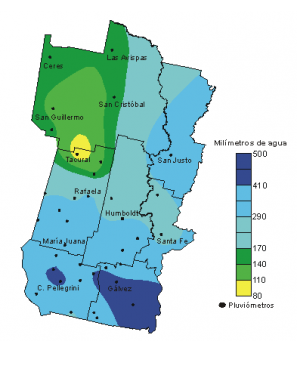El mayor registro de agua caída en el mes ocurrió en la localidad de Barrancas (departamento San Jerónimo) con 514 milímetros. Y el valor más bajo fue en la localidad de Tacural (departamento Castellanos) con 90 milímetros.