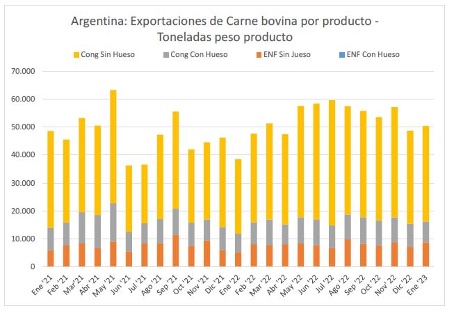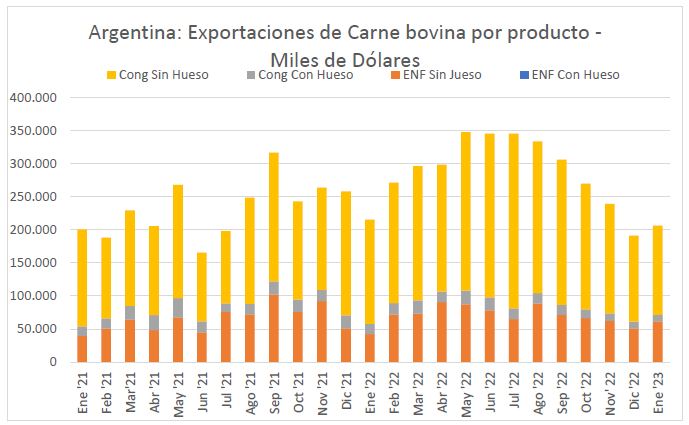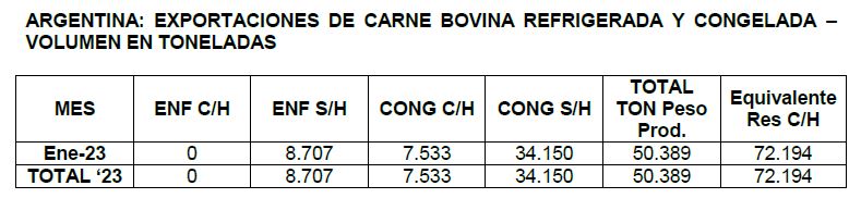 Las exportaciones de carne bovina del mes de enero de 2023 resultaron equivalentes a 72,2 mil toneladas res con hueso. Los volúmenes exportados en enero de 2023 representaron un 26,6% de las aproximadamente 271 mil toneladas res con hueso producidas en el período. El acumulado de los últimos doce meses de actividad, desde febrero de 2022 hasta enero de 2023, muestran exportaciones totales de carne bovina refrigerada y congelada por un volumen de 645,2 mil toneladas peso producto, equivalentes a 921,4 mil toneladas res con hueso; y un valor monetario obtenido de 3.450 millones de dólares.