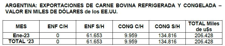 - Reactivación de las ventas con destino a los Estados Unidos, abierta la operatoria dentro de la cuota libre de arancel correspondiente al año 2023. En enero del corriente año se despacharon a este destino casi 1,0 mil toneladas de carne enfriada y más de 1,2 mil toneladas de carne congelada.