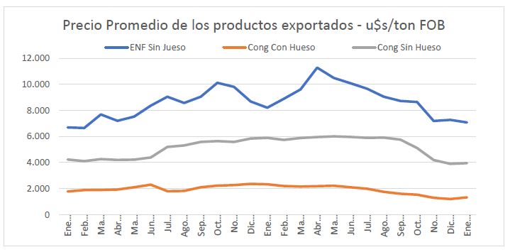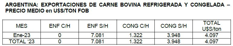 El precio promedio de exportación de carne bovina refrigerada y congelada resultó en el mes de enero de 2023 de u$s 4.097 por tonelada. Este valor resulta un (+4,3%) superior al obtenido en diciembre de 2022; y un (-26,7%) más bajo que el precio medio de enero de 2022, que había sido de u$s 5.590 por tonelada. En los últimos meses se observa una persistente tendencia a la baja de los precios en los principales destinos, desde el mes de mayo en adelante, tocando mínimos en diciembre de 2022, con u$s 3.928 por tonelada. Los u$s 4.097 promedio por tonelada obtenidos en el mes de enero de 2023 se ubican u$s 2.200 por debajo de los máximos registrados en el pasado mes de abril.