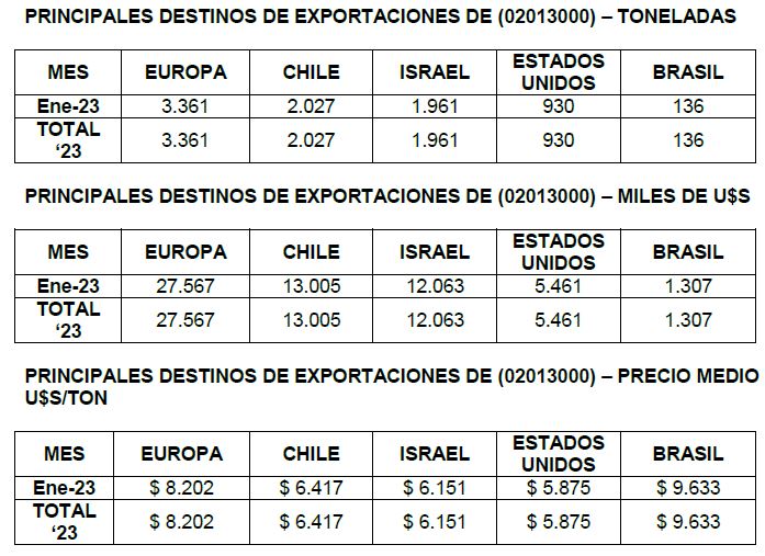 Los principales destinos de exportación para la carne refrigerada en enero de 2023 resultaron los países europeos (3,4 mil toneladas / 27,6 millones de u$s), Chile (2,0 mil toneladas / 13,0 millones de u$s), e Israel (2,0 mil toneladas / 12,1 millones de dólares).