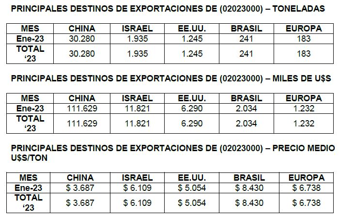 Los principales destinos de exportación para la carne congelada sin hueso en enero de 2023 resultaron la República Popular China (30,9 mil toneladas / 111,6 millones de u$s), Israel (1,9 mil toneladas / 11,8 millones de dólares), y los Estados Unidos (1,2 mil toneladas / 6,3 millones de dólares).