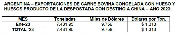“En enero de 2023, se exportaron 7,5 mil toneladas de carne congelada con hueso y huesos producto de la despostada, casi exclusivamente con destino a la República Popular China. El valor obtenido por las ventas al exterior dentro de esta partida ascendió a 10,0 millones de dólares, por lo que el precio unitario resultó de aproximadamente u$s 1.320 por tonelada.” Concluyó Ravettino.