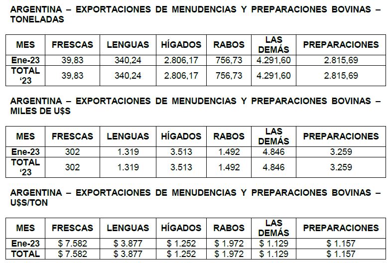 Las exportaciones de menudencias y preparaciones bovinas en enero de 2023 resultaron de 11.050 toneladas por un valor cercano a los 14,7 millones de dólares. Las Menudencias Bovinas Frescas o Refrigeradas, con EE.UU. como principal destino, tuvieron embarques por (40 toneladas / 302 mil dólares / u$s 7,582 por ton.); las Lenguas Bovinas Congeladas, con Rusia como principal destino, (340 toneladas / 1,3 millones de dólares / u$s 3.877 por ton.); los Hígados Bovinos Congelados, con Rusia como principal destino, (2.806 toneladas / 3,5 millones de dólares / 1.252 u$s por ton.); los Rabos Bovinos Congelados, con Sudáfrica como principal destino, (757 toneladas / 1,5 millones de dólares / 1.972 u$s por ton.); los Demás Despojos de la especie bovina Congelados, con Tailandia como principal destino (4.292 toneladas / 4,8 millones de dólares / u$s 1.129 por ton.); y las Preparaciones Bovinas, con Hong Kong como principal destino, (2.816 toneladas / 3,3 millones de dólares / u$s 1.157 por ton.).