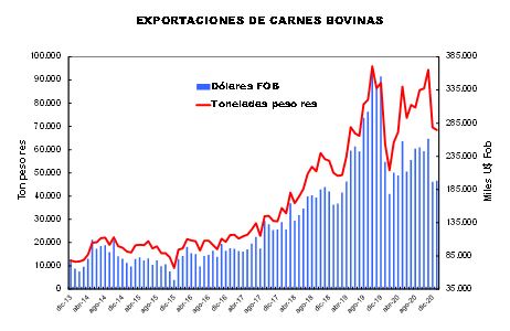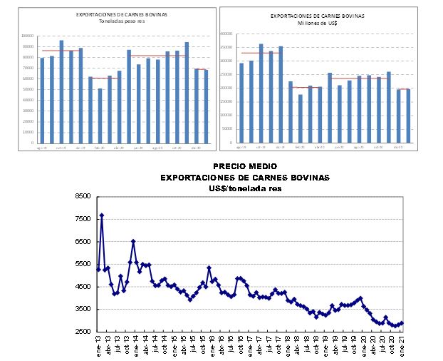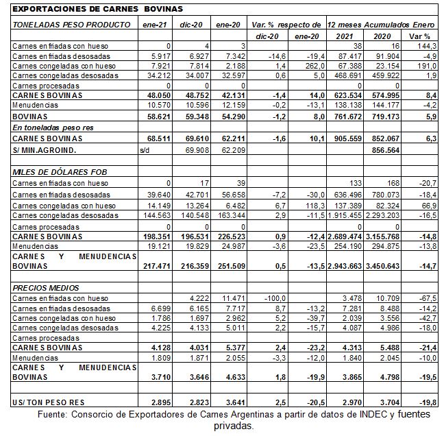 Buenos Aires, 26 de febrero de 2021 – De acuerdo a datos provisorios y parciales proporcionados por el INDEC, en el primer mes de 2021 las exportaciones de carnes bovinas sumaron 48 mil toneladas peso producto, equivalentes a 68.5 miles de toneladas peso res. Esta cifra está ligeramente por debajo de diciembre pasado, en que ya se observó una baja importante de los embarques, vinculada con la reducción de la demanda china y al impacto que el COVID 19 ocasionó sobre otros mercados, especialmente, en la Unión Europea. En el mes analizado, se facturaron 198 millones de dólares. El precio medio fue de 2895 US$ tonelada peso res, 21% menor al de enero 2020 y se encuentra entre los más bajos desde 2009.