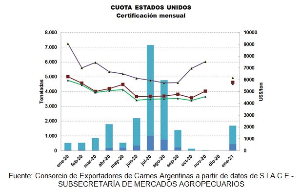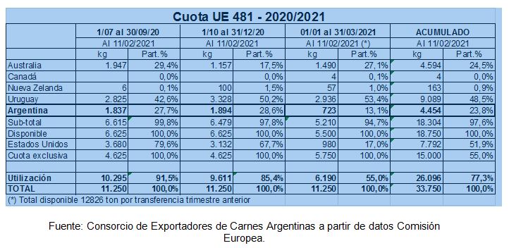 De acuerdo a datos de la Comisión Europea, al 11/02/2021 la porción correspondiente al Primer Trimestre de 2021, que por efecto del acuerdo suscripto con Estados Unidos, se ha reducido para el resto de las naciones a 5500 toneladas, se encontraba utilizada en casi 95%. En su cuota exclusiva, Estados Unidos utilizó el 17% y en el acumulado del ejercicio 2021 superó ligeramente la mitad de su total. Las operaciones argentinos de Cuota 481 han mercado considerablemente en el inicio de 2021.