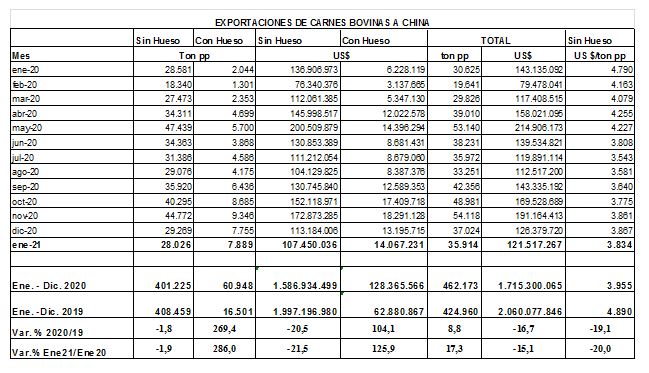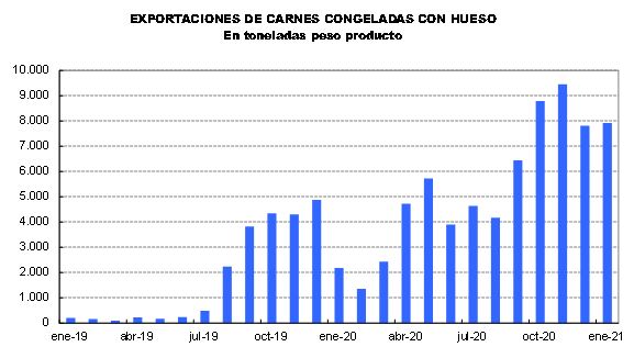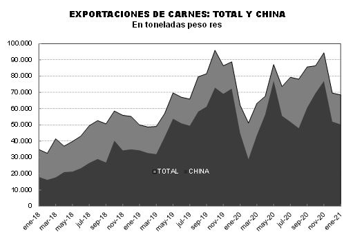 En el primer mes de 2021, China experimentó un incremento respecto a doce meses atrás, pero que se concentró en el rubro de las carnes con hueso.