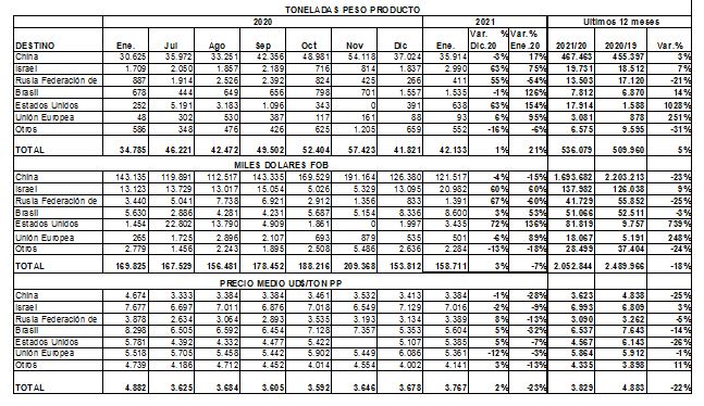 “Pese a la reducción experimentada al cierre del año pasado y en enero de 2021, las exportaciones acumuladas en los últimos doce meses sostienen un nivel que supera las 900 mil toneladas, similar al que se alcanzó en 2020. El cambio importante radica en los montos facturados, que denuncian una reducción del 15% si se compara con el acumulado a enero de 2020”, explicó el Presidente del Consorcio.