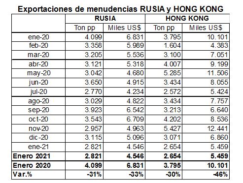 Rusia tiene una incidencia pequeña que se eleva al 3% cuando se suman las menudencias, en el caso de Hong Kong representa alrededor del 3% del total facturado.