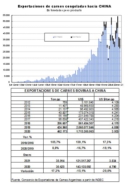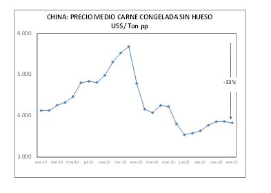 “Las oscilaciones que afectaron al mercado chino se han reflejado no sólo en los volúmenes remitidos sino también sobre las cotizaciones. En el primer mes de 2021, el valor medio de las exportaciones de carnes congeladas desosadas cayó un 33% respecto del pico alcanzado en diciembre de 2019” agregó Ravettino.