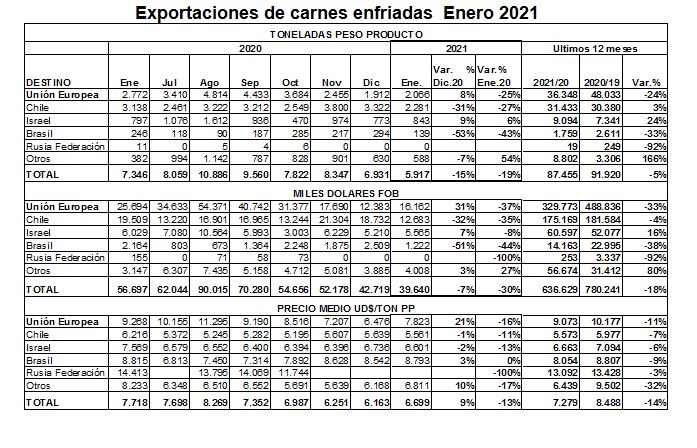En el mes de enero, las exportaciones de carnes enfriadas alcanzaron 5917 toneladas peso producto, 15% menos que en el período anterior. Como se mencionará, ello está asociado a la debilidad de la Unión Europea. Esta evolución se conjugó con la baja de Chile.