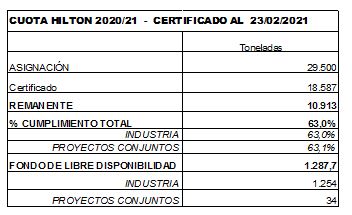 Al 23 de febrero de 2021, se habían certificado 18.587 toneladas, equivalentes al 63% del total, que era similar en el contingente Industria y en el reservado para Proyectos Conjuntos. En el Fondo de Libre Disponibilidad se sumaron las renuncias realizadas al 11/02/2021, como establece la normativa vigente, se estima que ya se han utilizado alrededor de 360 toneladas.