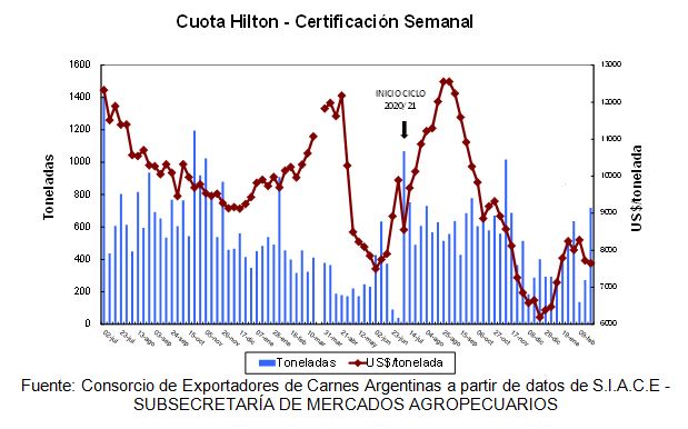 La demora que existe en la certificación de las operaciones dentro del contingente determina que las estadísticas no registren rápidamente la realidad del mercado. Como puede observarse, hubo una baja en el volumen certificado semanalmente, vinculado con los menores requerimientos de la demanda, que se agudizaron en los cortes más preciados. Los últimos precios promedio disponibles acusan una mejora pero aún no reflejan la evolución más reciente.