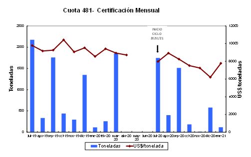 En el primer mes de 2021, se certificaron 118 toneladas dentro de la cuota UE 481, una cifra reducida comparada con el período precedente. El precio medio fue de 7779 US$/tonelada, que demuestra una mejora considerable, aunque debe resaltarse que se lo compara con el valor más bajo desde que se comenzó a operar dentro del contingente. El total acumulado sumó 4560 toneladas, 27% menos, comparado con lo exportado por nuestro país a enero de 2020.