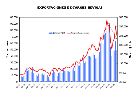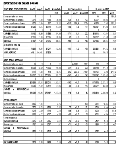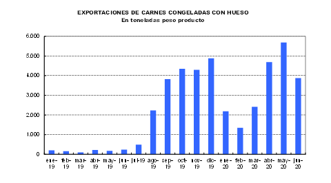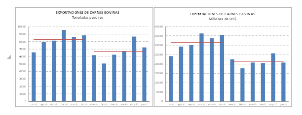 Durante junio de 2020, las exportaciones de carnes congeladas sumaron 44 miles de toneladas peso producto por valor de 168 millones de dólares, el 87% del monto total facturado en concepto de carnes bovinas. En relación con el período precedente, se registraron bajas del 20 y 25%, en volumen y valor respectivamente.