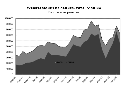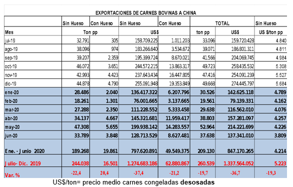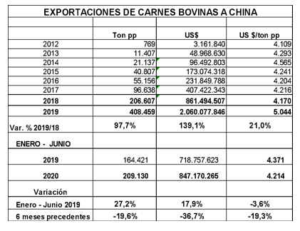 En el primer semestre de 2020, se han remitido a China un total de 209 mil toneladas peso producto de carnes congeladas por valor de 847 millones de dólares, 20 y 37% por debajo de lo exportado en la segunda mitad de 2019, 27 y 18% más si se compara con enero a junio del año pasado.