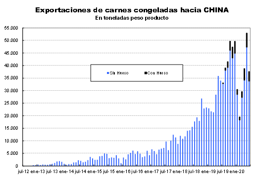 El rubro de las carnes congeladas con hueso revirtió la tendencia ascendente de meses precedentes, y en este orden también fueron un factor fundamental las compras de China.