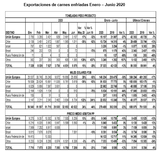 Entre enero y junio de 2020, las exportaciones de carnes enfriadas sumaron 37 mil toneladas, reportando 280 millones de dólares, 12% y 23% menos, respectivamente que en 2019. En el período de doce meses cerrado en junio pasado, se han remitido 86 mil toneladas de carnes enfriadas por valor de 689 millones de dólares, 8% menor a igual lapso a junio de 2019.