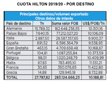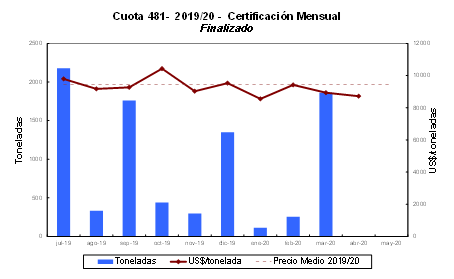 De acuerdo a la información proporcionada por la Subsecretaría de Mercados Agropecuarios en Mayo de 2020, se dio por cerrado el ciclo 2019/20, con un total certificado de 8550 toneladas que reportaron 80.5 millones de dólares. Como resultado de la administración trimestral del contingente y de su rápida utilización en los primeros días de cada nuevo trimestre, los embarques del período abril – junio se acumularon en el mes de marzo y prácticamente no se certificaron operaciones en los meses siguientes.