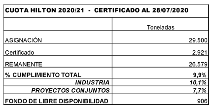 Esta información de UE permite anticipar los datos correspondientes al ejercicio 2020/2021, que todavía no han sido informados por nuestras autoridades, contabilizando al 14/07/2020 – correspondientes al trimestre en curso – embarques desde nuestro país por 1270 toneladas; así como también, 1387 y 2383 toneladas procedentes de Australia y Uruguay, respectivamente. Al dìa de fecha, aún se encontraban disponibles 827 toneladas y era muy escasa la ejecución de la porción que beneficia a Estados Unidos.