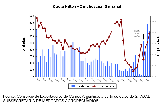A su vez, la finalización del ciclo Hilton y el inicio del ejercicio 2020/21 han determinado una recuperación en el ritmo de embarques del contingente, que además se ha visto favorecido por la flexibilización de las restricciones en los países europeos, si bien son todavía importantes las distorsiones en este mercado. Las cotizaciones alcanzadas son también una clara evidencia de un escenario más favorable.