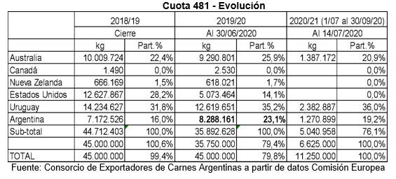 Argentina, Australia, Nueva Zelanda y Uruguay, siendo las naciones habilitadas para su certificación, tuvieron disponibles 35.750 toneladas. En consecuencia, con los datos recientemente publicados por la Comisión Europea sobre la evolución del contingente 481, Argentina habría participado con el 23% de su total.