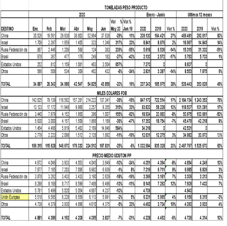 China mantuvo su claro liderazgo en el ranking de los principales destinos, con una participación del 66% sobre el valor total exportado. Le sigue la Unión Europea (12%), Israel y Chile (7%). Rusia tiene una incidencia pequeña que se eleva al (4%) cuando se suman las menudencias, en el caso de Hong Kong representa alrededor del (4%) del total facturado.