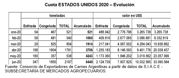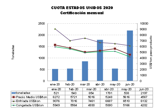 El valor total exportado dentro del contingente fue de 33 millones de dólares a un precio medio de 5138 US$/ tonelada, con una media de 6132 y 4202 US/tonelada para carnes enfriadas y congeladas, respectivamente. Los valores registraron en junio una baja en relación con el mes precedente.