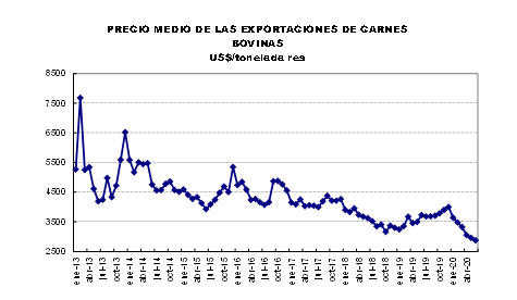 El precio medio se ha caracterizado por una tendencia descendente, acentuada en los últimos meses ante la menor presencia de los cortes más preciados que se destinan a la Unión Europea y de las carnes enfriadas en general. Los efectos de las dificultades del mercado asociadas al COVID 19 han golpeado con mayor intensidad el rubro de las carnes enfriadas. De no haber mediado China, el impacto en nuestros embarques habría sido considerable.