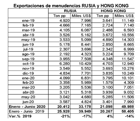 Los embarques hacia Hong Kong han venido compensado la evolución descendente que caracteriza al mercado ruso y que han determinado su fuerte caída en comparación al año anterior.