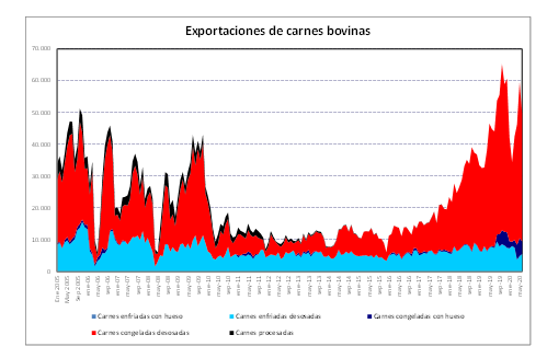 Entre enero y junio de 2020, se exportaron 237 mil toneladas de carnes congeladas que sumaron 1002 millones de dólares. La evolución ascendente a lo largo del año pasado determinó que las exportaciones de carnes congeladas acumuladas en los últimos doce meses superen 526 mil toneladas peso producto, por valor de 2488 millones de dólares, 63% por encima del período de doce meses cerrados en junio de 2019.